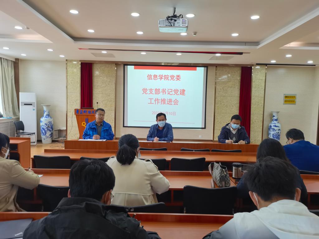 5月10日下午,信息学院党委在402会议室召开党支部书记党建工作推进会,学院党委书记刘庆、院长刘国柱、党委副书记兼副院长王军出席会议,各支部书记参加会议。会议由学院党委书记刘庆主持。