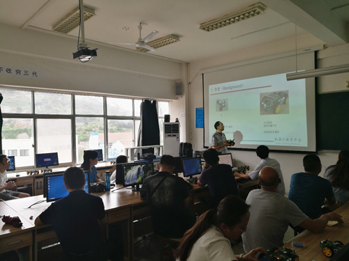 报告会还展示了信息科学技术学院与陈以农教授合作研发的智能小车等智能硬件设备产品,与会代表在陈以农教授、青岛科技大学马兴录、江守寰、刘洋老师等指导下,完成了基于ASU VIPLE的可视化编程的项目实战,基于Python的机器人编程实践等多个实验项目。
