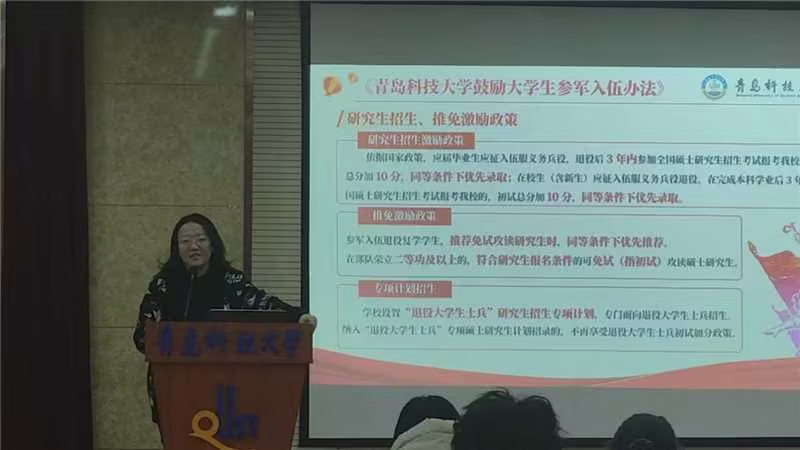 第一环节,丛文翠对大学生入伍享受的国家优惠政策及学校下发的《青岛科技大学鼓励大学生参军入伍办法》(青科大字〔2024〕14号)进行解读,从学生关切出发,帮助学生厘清“三笔账”,分别是“政治账”“发展账”和“经济账”。第二环节,退伍学生刘骐鸣、李业兴分别从考研经历、军旅生涯以及体检注意事项等多方面入手,分享入伍经验,并就现场同学提出的问题进行细致解答。